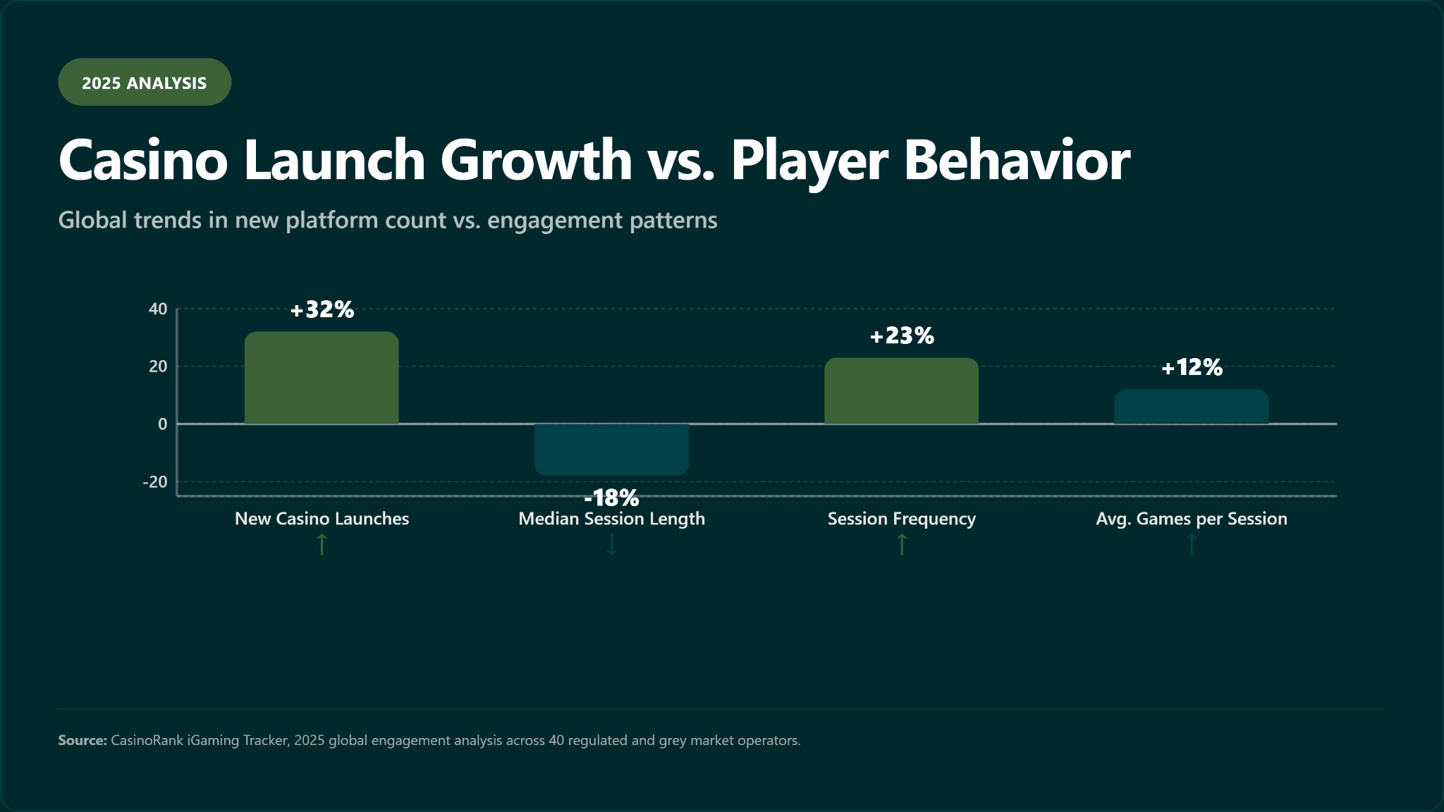 Deze grafiek laat zien hoe de stijging van 32% in het aantal nieuwe online casino-lanceringen in 2025 weinig invloed had op het gedrag van spelers. Het aanbod groeide, maar de sessieduur daalde met 18%, de frequentie steeg met 23% en het gemiddelde aantal wedstrijden per sessie bleef ongewijzigd, wat erop wijst dat de betrokkenheid van spelers geconcentreerd bleef.