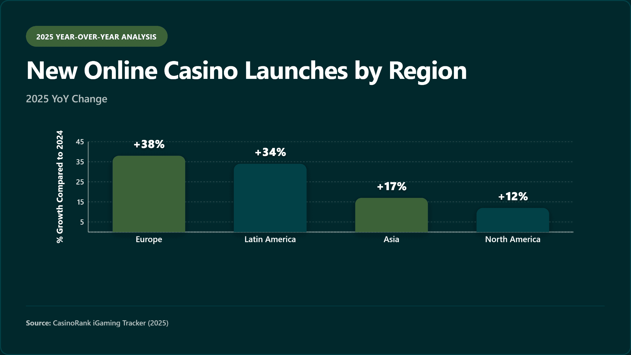 Het aantal nieuwe online casino's wereldwijd gelanceerd in 2025 steeg met meer dan 30% in vergelijking met 2024. Europa en Latijns-Amerika leidden in volume, terwijl Azië en Noord-Amerika een meer gecontroleerde expansie kenden.