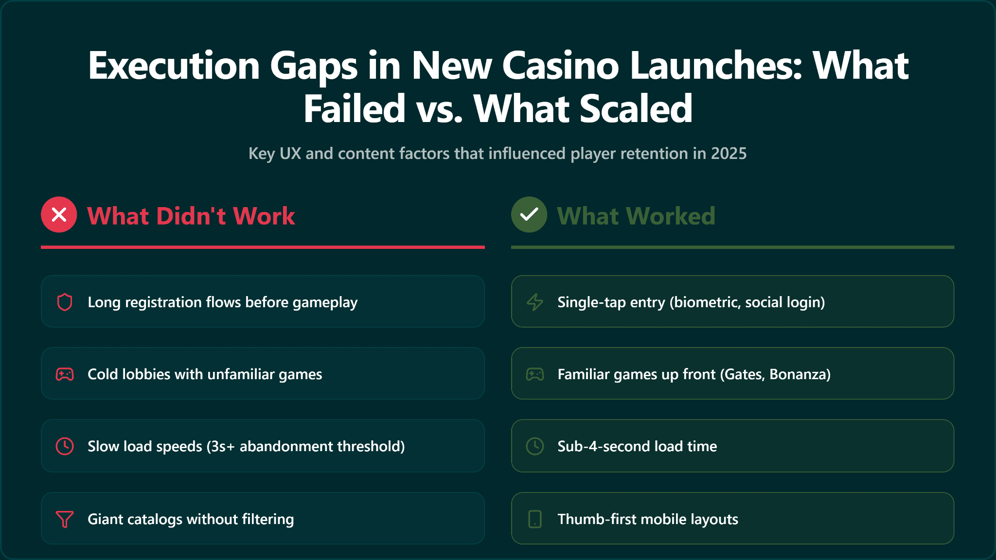 Deze visual vergelijkt mislukte UX-patronen met kenmerken van goed presterende casino-lanceringen in 2025. Snelheid, vertrouwdheid en eenvoud presteerden consequent beter dan grote catalogi of complexe flows.
