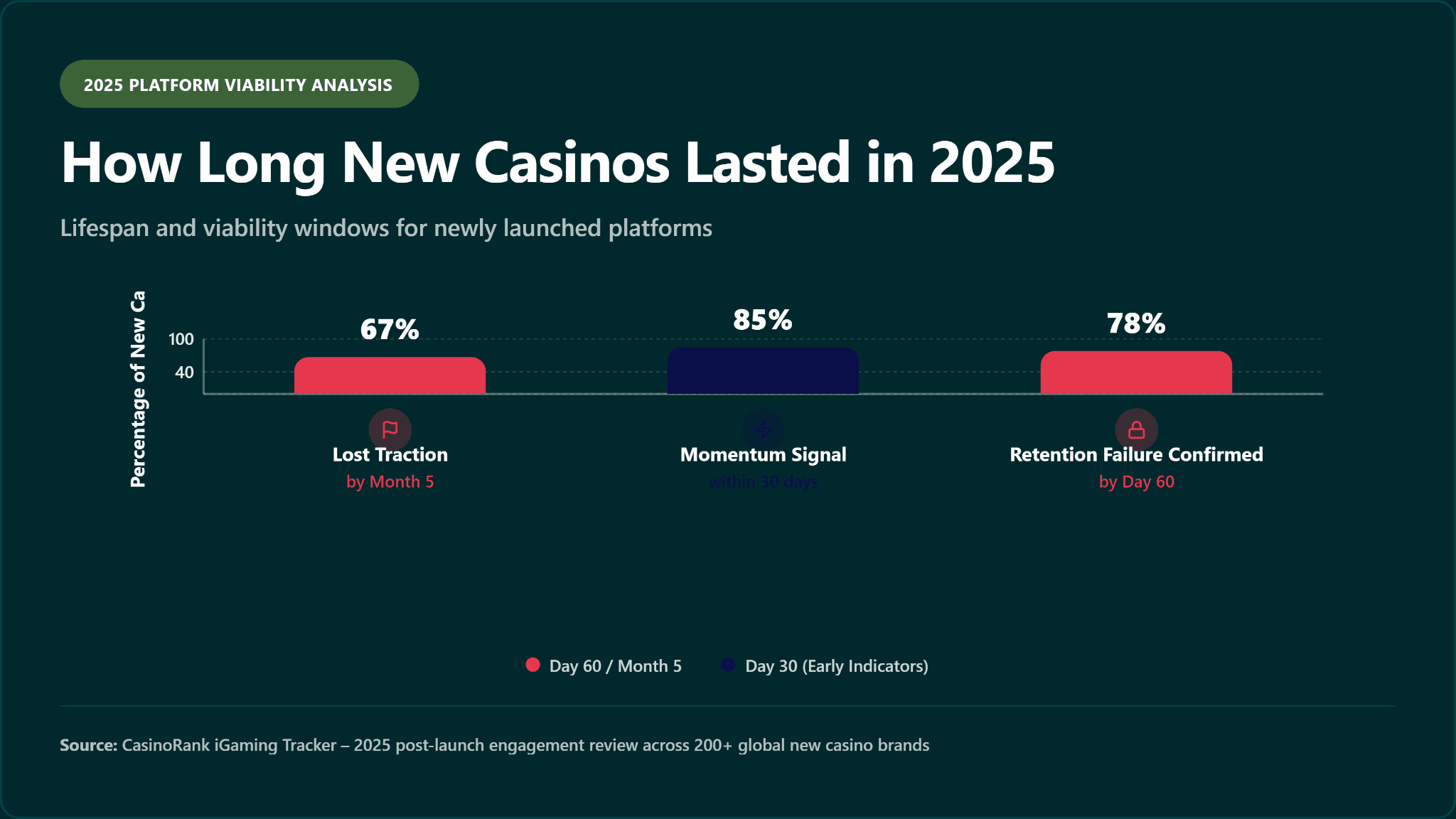 Deze tijdlijngrafiek laat zien hoe snel nieuwe casino's er in 2025 niet in slaagden gebruikers te behouden. Platforms hebben nu te maken met een overlevingsdrempel van 60 dagen, waarbij de levensvatbaarheid wordt beoordeeld op dag 30.